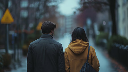 A couple walks away from each other on a quiet urban street, showcasing a mood of reflection and connection amidst a serene and slightly rainy backdrop.
