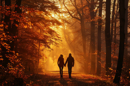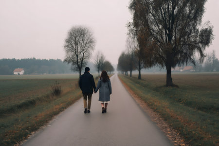 Romantic couple walking hand in hand along a serene country road, surrounded by vibrant autumn trees, enjoying a peaceful moment together