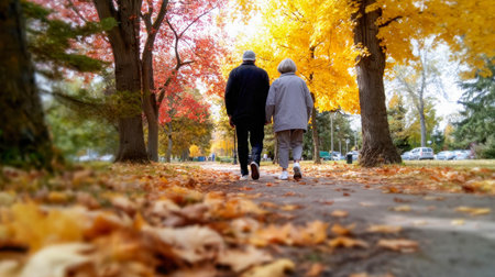 Elderly couple walking hand in hand through a colorful autumn park with golden and red leaves.