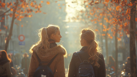 Two young women walking in the city in autumn, back view.