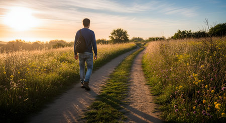 A rear view of a man with a backpack walking along a dirt path through a grassy field towards the sunset. The scenic landscape evokes feelings of freedom, travel, exploration, and the journey of life.