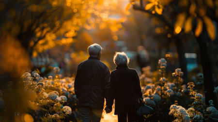 An elderly couple walks hand in hand through a garden path, bathed in warm, golden sunset light, surrounded by flowers.