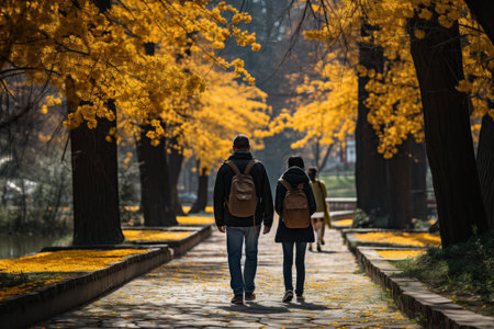 Autumn Walk. A couple of a man and a woman holding hands walk through the park with fallen yellow leaves.
