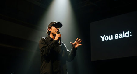 A man wearing a cap stands on a dark stage, holding a microphone and gesturing with his hands while speaking. A bright spotlight illuminates him. In the background, a projection screen the text You said:. The scene suggests a presentation, a talk, or a performance in a modern setting, focusing on the act of communication and conveying a message.