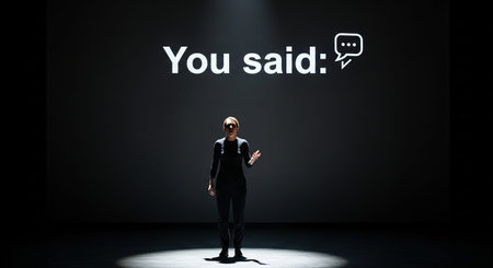 A solitary woman stands on a dark stage, bathed in a single spotlight. Behind her, a large screen the white text You said: accompanied by a stylized speech bubble The stark contrast between the illuminated figure and the dark background creates a dramatic and focused atmosphere, suggesting a moment of reflection or a pivotal statement in a performance or presentation.