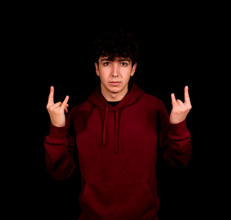 A man shows the Hookem horns gesture and shouts loudly against a red background in the studio. Rock music concept