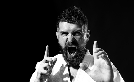 Portrait of self confident brutal man. Strong muscular fitness model showing competition strength. Caucasian male model staring angry. Portrait of screaming karate master instructor. Black and white.