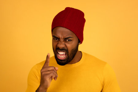 Feeling so angry Portrait of furious young African man looking at camera and shouting while being in front of black background : Generative AI