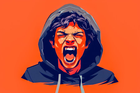 Expressive Hooded Male Character Illustration Showcasing Extreme Emotion on Vibrant Orange Background AI Generative