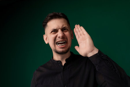 Man in eyeglasses having troubles with hearing, being deaf. Guy gesturing with hand close to ear.