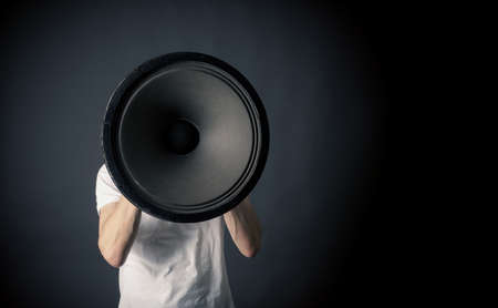 Young man holding a big speaker, speaking loud concept on a dark studio background with space for text or image