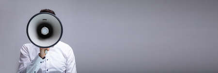 Man Making Announcement Using Megaphone Against Gray Background