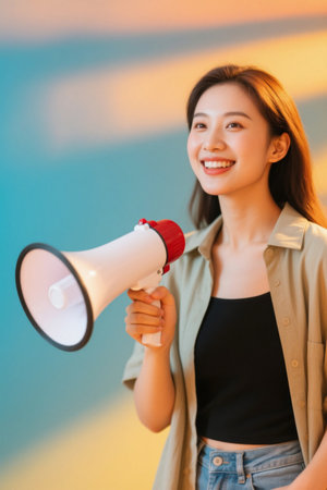 Caucasian young woman holding megaphone.