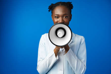 Afro american female doctor in white medical gown scream in megaphone in studio
