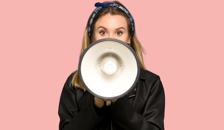 Teenager girl with leather jacket shouting through a megaphone on isolated pink background