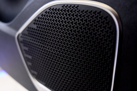 Close-up view of a car audio speaker showcasing intricate textures and captivating lighting. Perfect for highlighting sound technology and interior design.