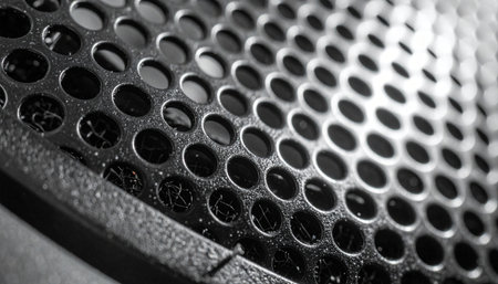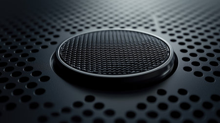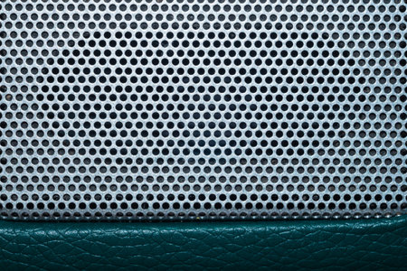 Close-up perforated speaker grille, textured surface, dark gray, audio technology