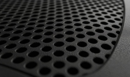 This close-up image showcases a black speaker grill featuring a unique textured mesh design, reflecting light and emphasizing modern audio technology.