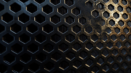 This detailed image captures a close-up view of a textured metal surface featuring circular holes. The industrial design and interplay of light create a striking visual effect.