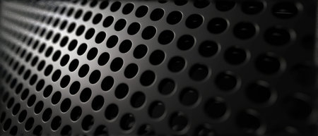 Macro shot of a black perforated metal surface with circular patterns.