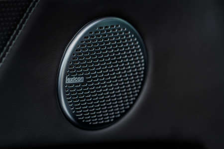 Sound speaker in a modern car door panel. Close up car speaker on car door panel. Black car sound speakers close-up on a black background, audio system, hard bass subwoofer