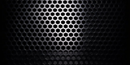 Macro shot of a large and a smaller speaker driver covered by a hexagonal metal grille, highlighting the technology, sound, and music equipment in a dramatic, dark setting