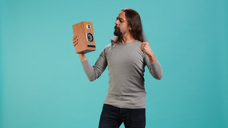 Portrait of person having fun holding speakers, listening music, dancing on rhythm. Cheerful man entertaining himself hearing songs with powerful bass, nodding head, studio background, camera A