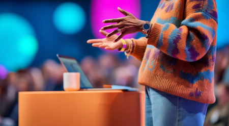 Close-up of a speaker's hands mid-gesture in a colorfully lit environment, standing at a podium with a mug and laptop. Expressive communication captured.