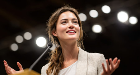 Female speaker with long hair, enthusiastically addressing audience from podium, showcasing dynamic gestures and engaging presence in a professional conference environment