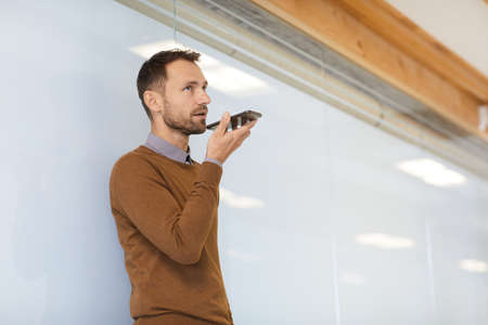 Mature businessman talking on mobile phone he standing at office and recording audio message on the phone