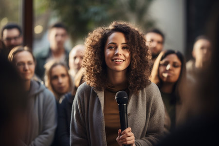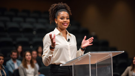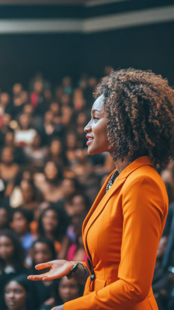 Motivation woman speaker on stage give speech to audience in the meeting public conference. Indoor seminar lecture for inspiration and confident to auditorium. Leader coach in convention, AI Generated