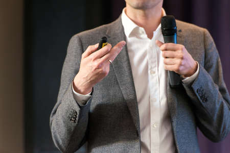 Business and speech topic: Man in a gray suit holding a black microphone and multimedia projector remote a on a dark violet background