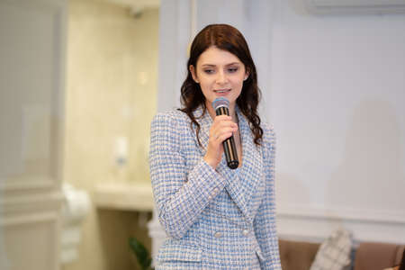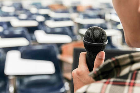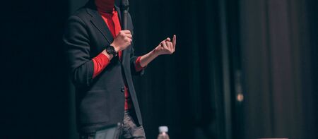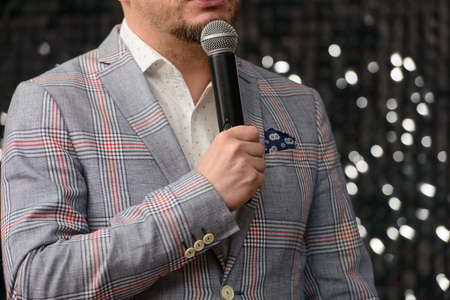 Business and speech topic: Man in a checkered jacket holding a black microphone. Horizontal photo