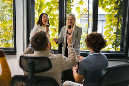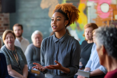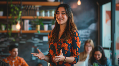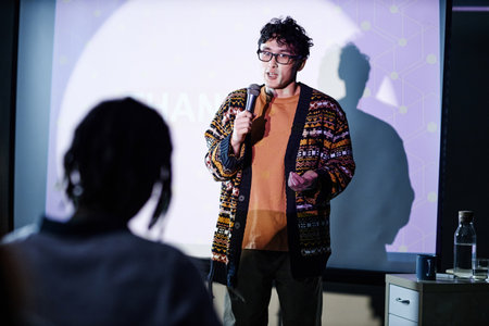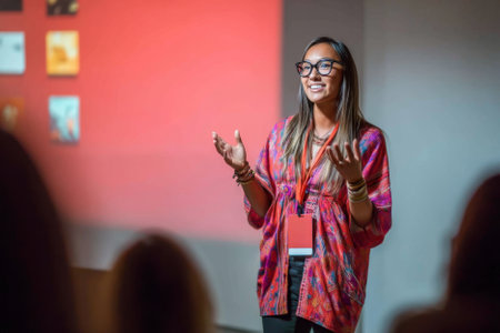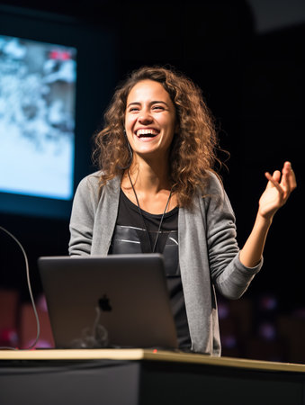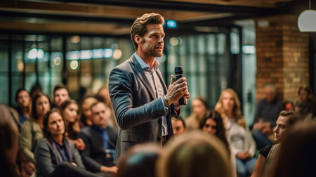 Confident presenter engaging audience during startup pitch, business setting. generated by ai