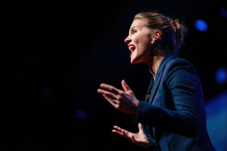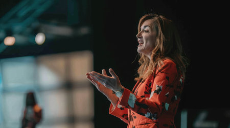 Side view of a woman in a navy blazer passionately delivering a speech at a leadership conference. The dynamic posture and high contrast lighting emphasize her expressive delivery.