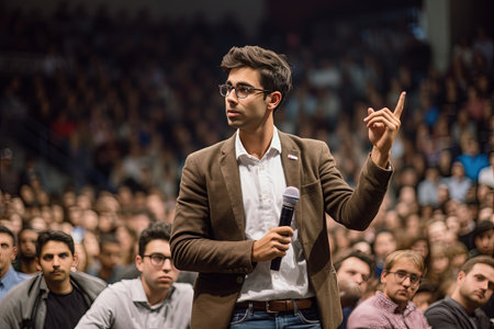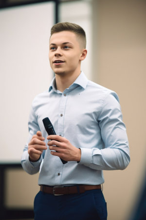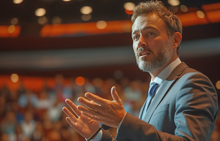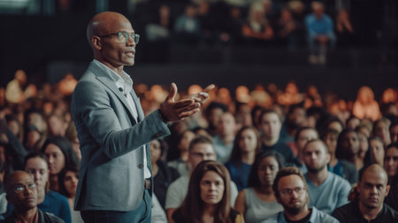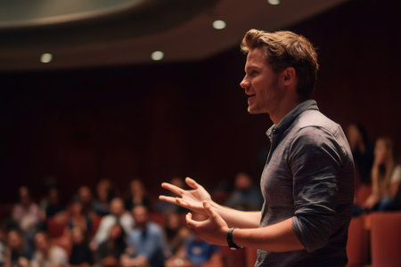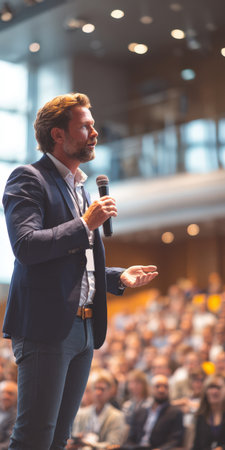 Young businessman giving a motivational speech during a conference in a modern auditorium, inspiring the audience with his engaging presentation