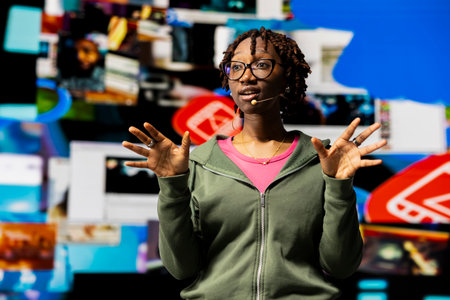 Influencer doing key note presentation in front of audience using visualizations on digital interface. Digital creator using mic to speak about content creation and social network experiences