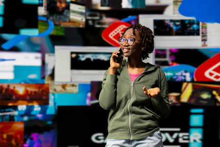 Woman with relaxed mood using smartphone to call friend, discussing movies, standing in front of vibrant video wall collage. Person excited to call mate on phone and chat about tv shows