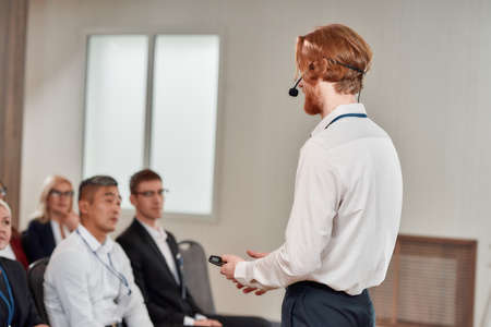 Your education is our priority. Young male speaker in suit with headset and laser pointer giving a talk at business meeting