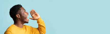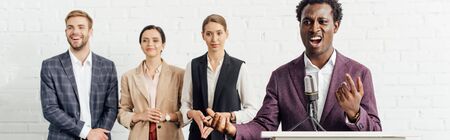 Horizontal medium portrait of young African American art gallery curator holding microphone speaking about current exhibition