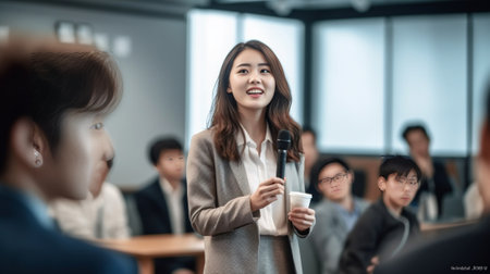 Generative AI is used to deliver a speech by a successful Asian businesswoman.
