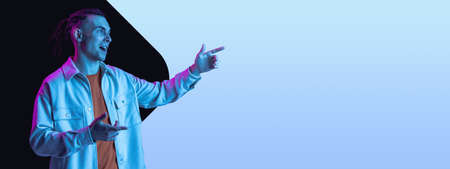 Young handsome man isolated over blue black background in neon light. Concept of beauty, fashion,ad. Flyer