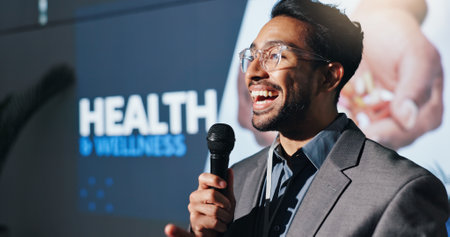 Conference, talking and man with mic, speech or public speaking for health, wellness and discussion. Happy, speaker and person with tech for presentation, stage or awareness for preventive healthcare