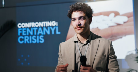 Forum, microphone and presentation with man in auditorium for speech on fentanyl crisis. Business, seminar and trade show with guest speaker on podium or stage for drug abuse or addiction solutions