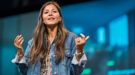Woman in denim jacket speaking passionately during a public event, making expressive gestures and connecting with the audience from stage.