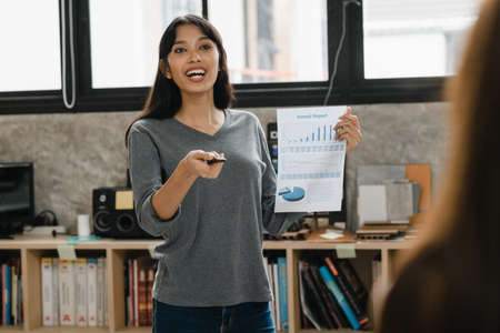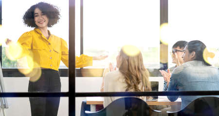 Generative AI : Young asian businesswoman explain idea to group of creative diverse team at modern office Manager standing against rear view of multiethnic people Audience applaudi