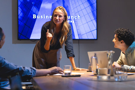 Leading presentation, businesswoman engaging colleagues with confident gesture in conference room. Leadership, teamwork, communication, professional, collaboration, executive