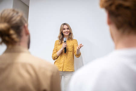 Stage, presenter and woman with mic, discussion and smile for public speaking in seminar or talking. Confident, motivational speaker and person with advice for entrepreneurship, speech and meeting