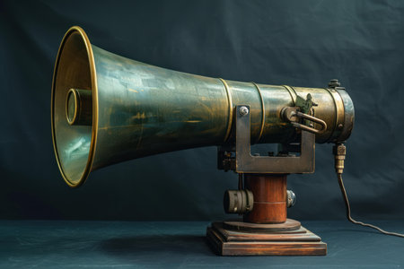 Antique brass megaphone standing on wooden base, emanating an aura of history and communication from a bygone era