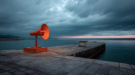 Orange megaphone art installation stands prominently on a concrete pier, symbolizing a loud voice and significant communication against a dramatic, moody sea and cloudy sky at dusk